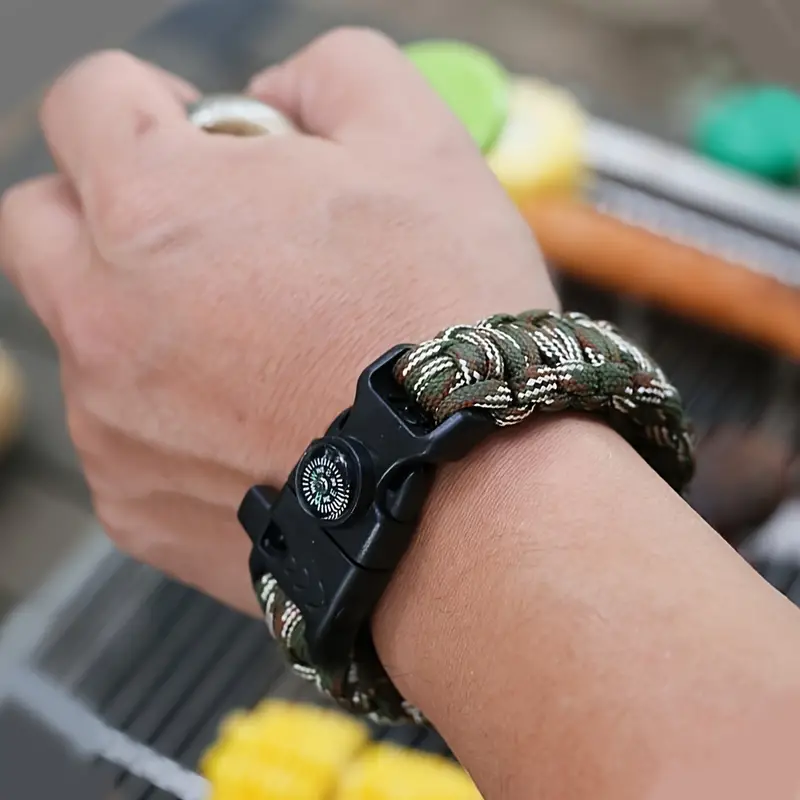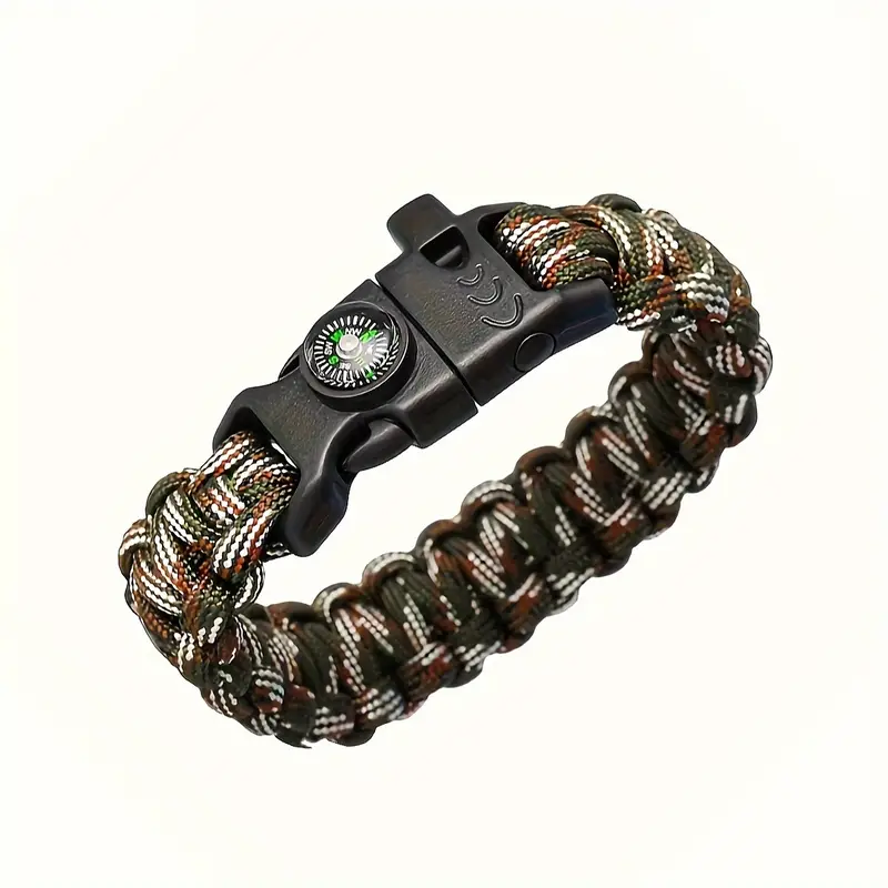 Survival paracord bracelet with built-in compass, whistle, and fire starter. Essential gear for any adventure.